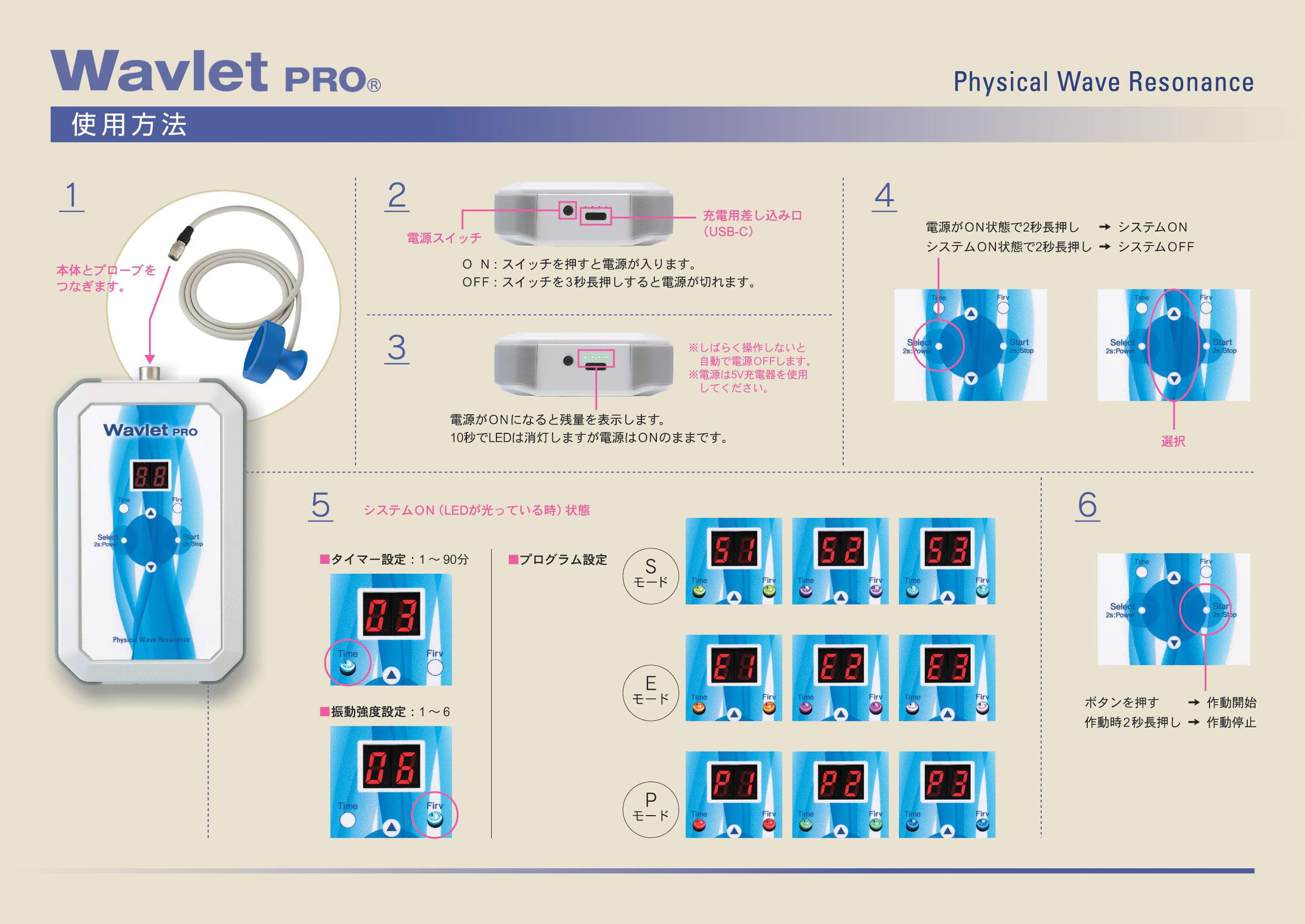 この革新的な機器は、人体の各器官がもつ固有の振動波長や利用目的にあわせて9つの振動プログラムを選択することが可能で、従来の方法では得られない作用を実現します。Wavlet PROは、どの部位にも簡単に使用することができ、他の治療器との組み合わせも可能です。服の上からでも、直接肌に触れても、枕やマットを介してでもご利用いただくことが可能です。